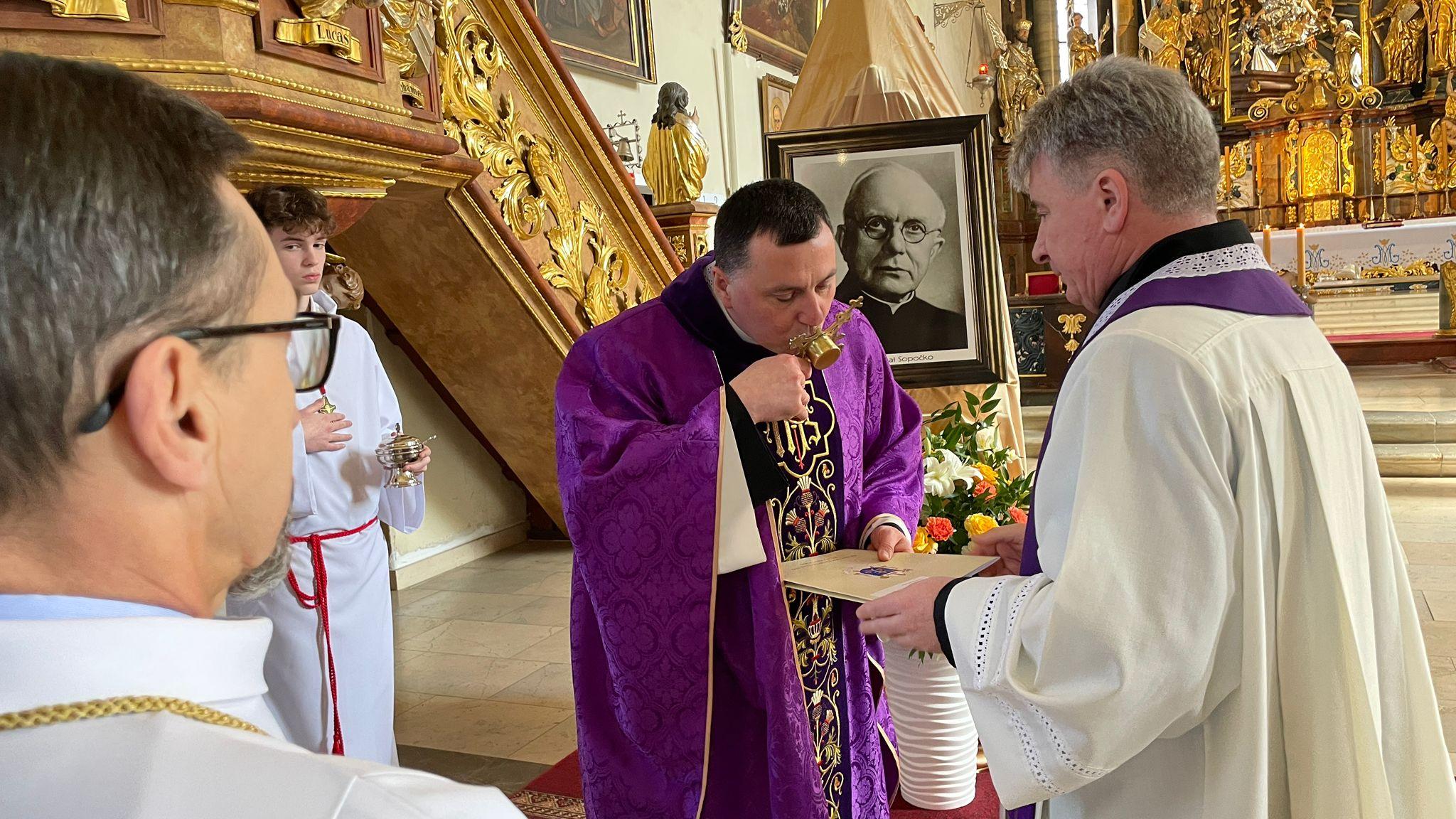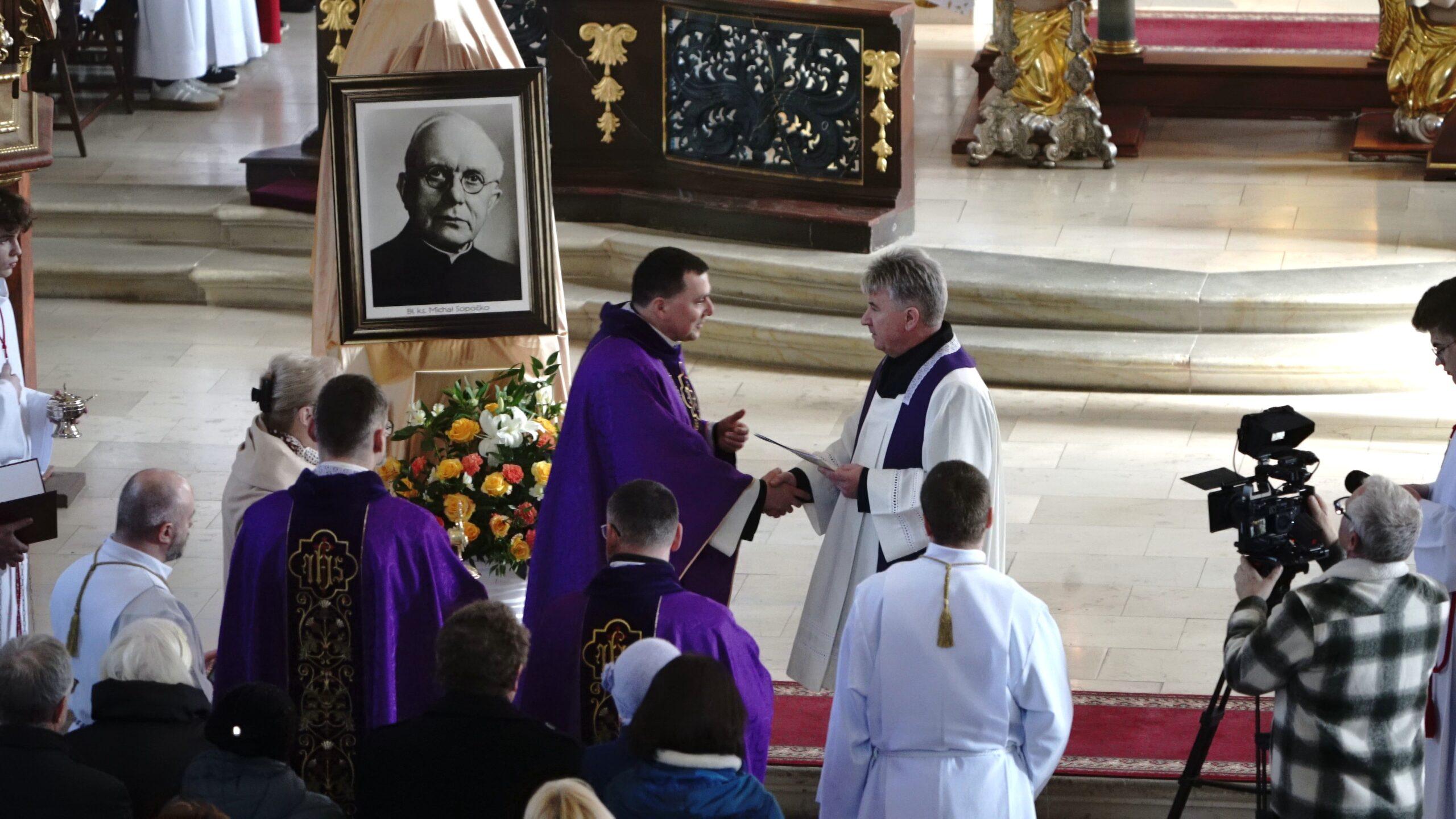 To nabożeństwo pasyjne i szereg konferencji prowadziły nas do niedzielnej sumy, podczas której nastąpiło uroczyste wprowadzenie relikwii patrona rekolekcji do Bazyliki. Na początku liturgii ks. Ireneusz odczytał dekret Arcybiskupa Białostockiego w myśl którego otrzymaliśmy do publicznej czci relikwie. Następnie nastąpiła intronizacja w wyznaczonym miejscu, okadzenie i odczytanie modlitwy za wstawiennictwem bł. Michała Sopoćko.
