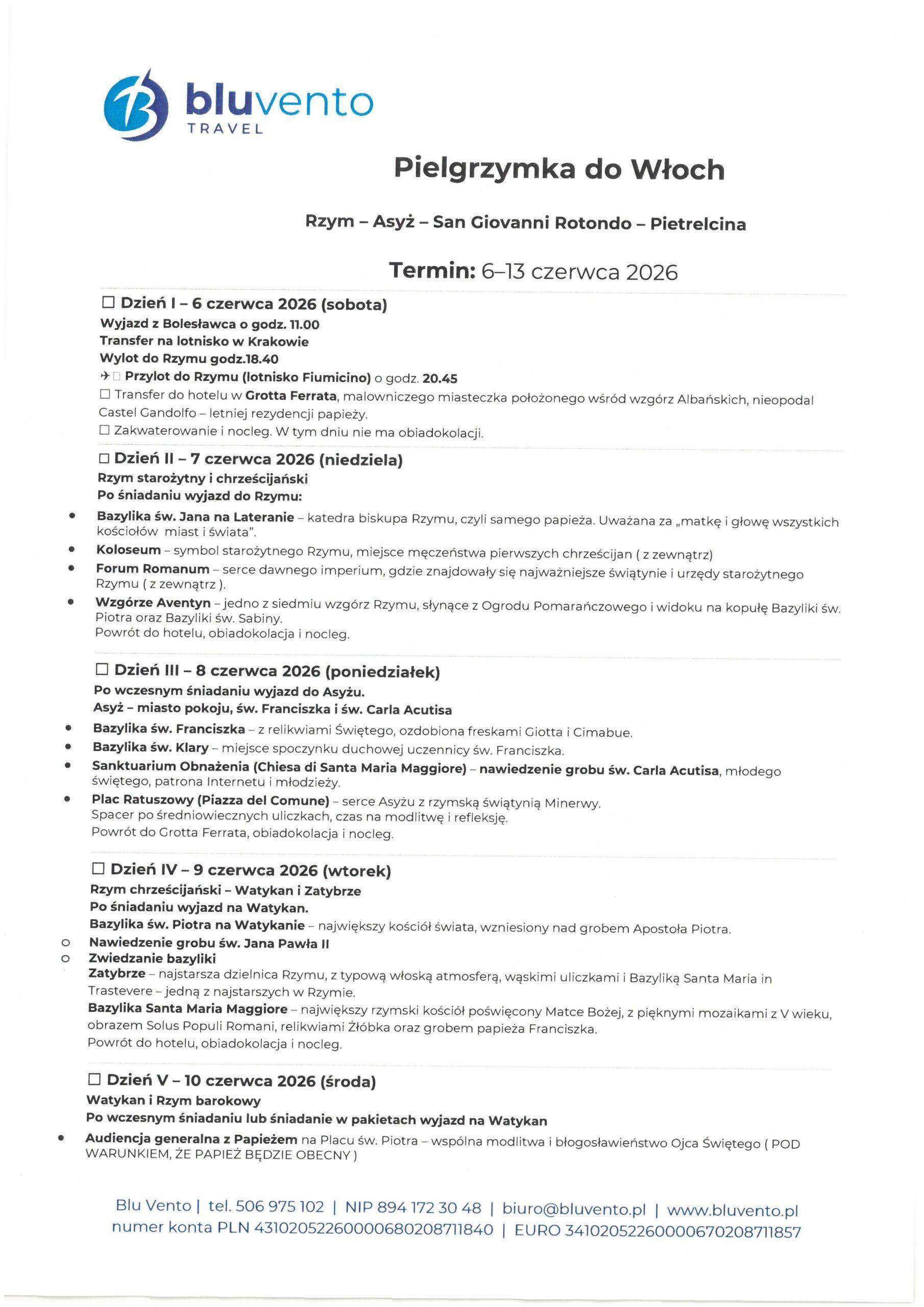 Parafia nasza organizuje pielgrzymkę do Włoch w czerwcu 2026. Zapraszamy do zapoznania się z programem i wspólnego pielgrzymowania. Od dziś przyjmujemy zapisy.