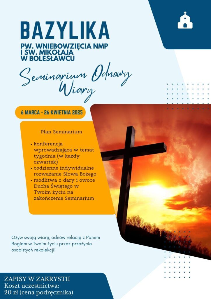Wspólnota Odnowy w Duchu Świętym przy naszej parafii zaprasza wszystkich chętnych do udziału w Seminarium Odnowy Wiary, które odbywać się będzie od 6 marca do 26 kwietnia. To forma rekolekcji ewangelizacyjnych, na którą składają się cotygodniowe konferencje połączone z modlitwą i dzieleniem Słowem Bożym oraz osobista codzienna medytacja fragmentu Pisma Świętego. Osoby zainteresowane prosimy o zapisanie się w zakrystii. Koszt udziału 20 zł – jest to cena podręcznika, który będzie pomocą przy przeżywaniu tych rekolekcji.
