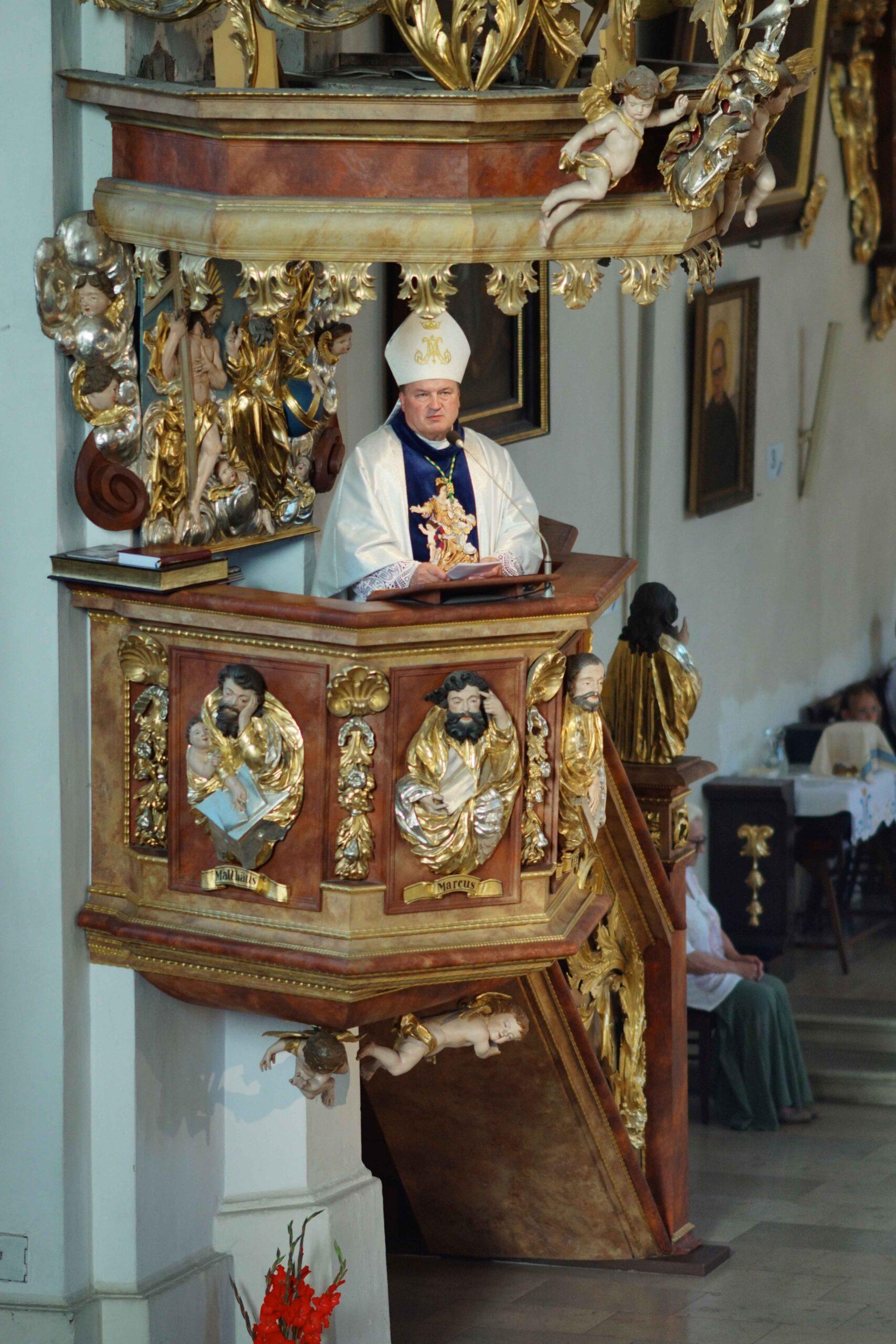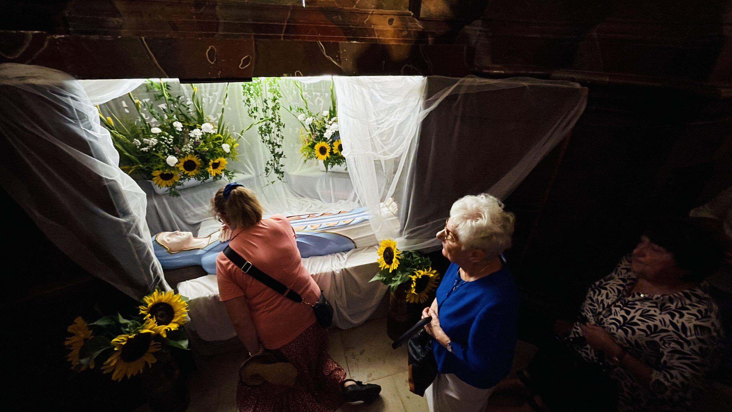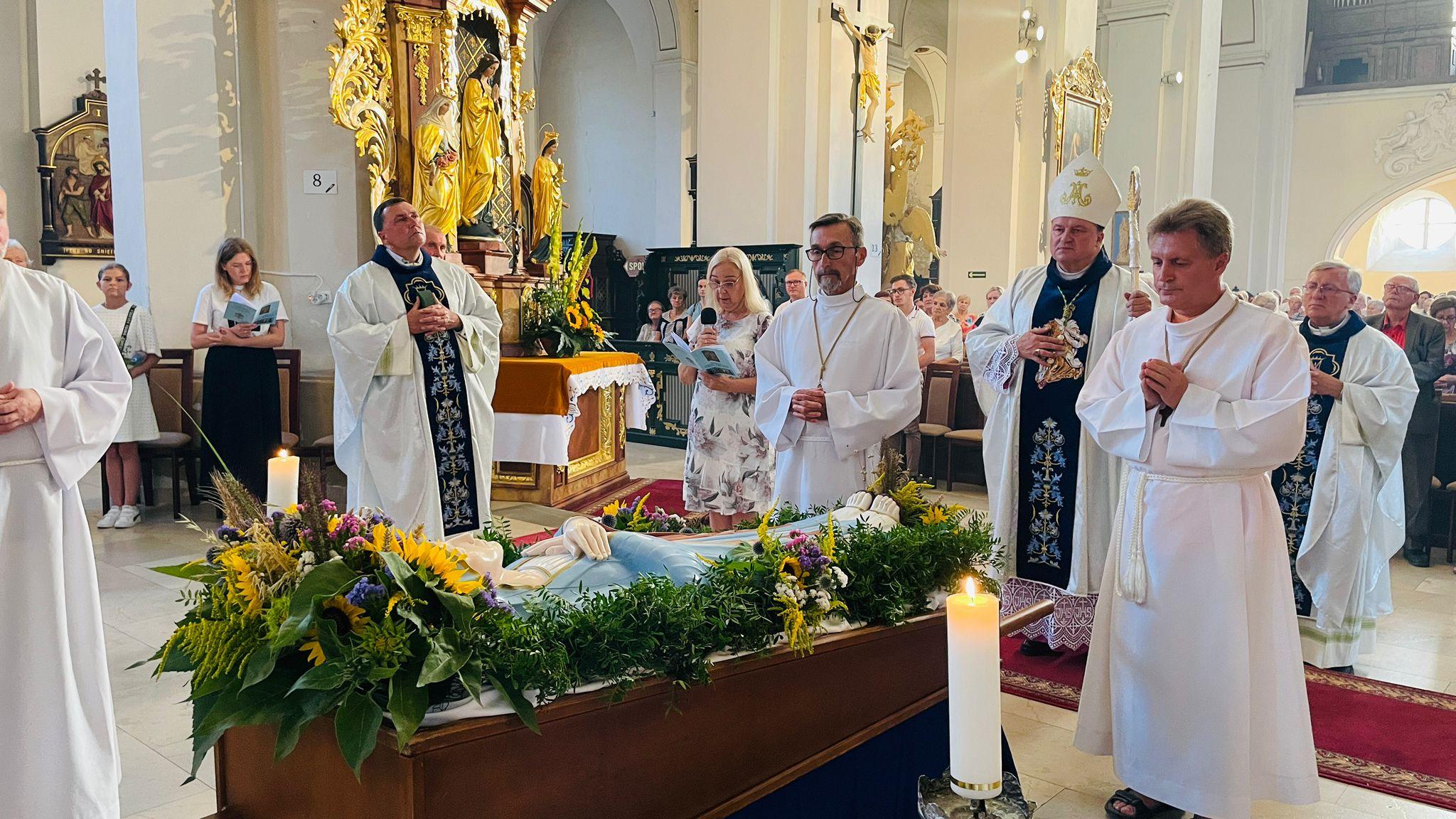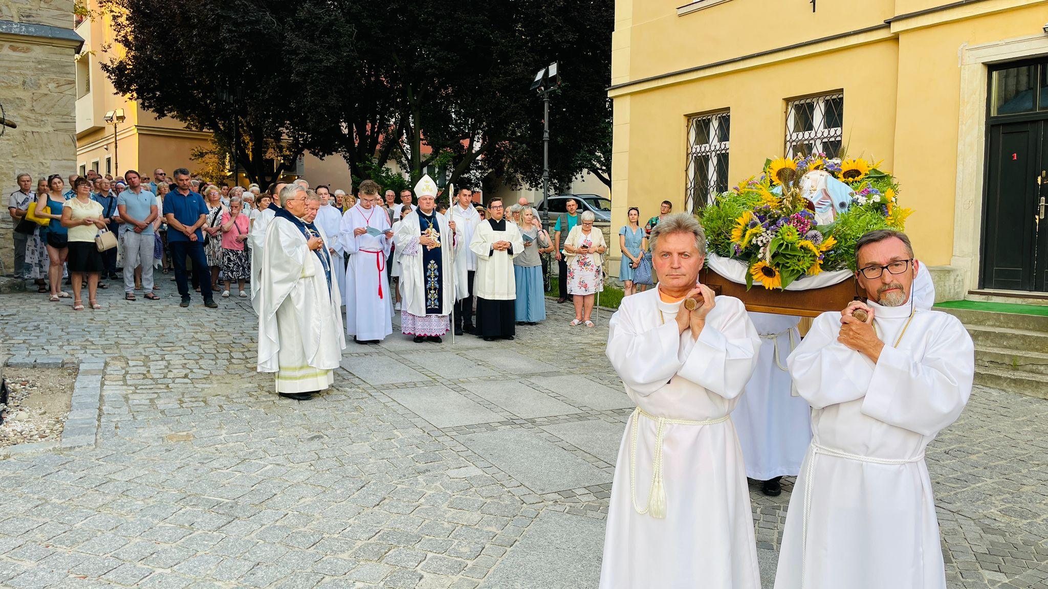 Do wielowiekowej tradycji, ale także wiary chrześcijan Wschodu i Zachodu nawiązywało Nabożeństwo Zaśnięcia i Pogrzebu Matki Bożej. To nabożeństwo to także wieloletni zwyczaj miejscowej wspólnoty, która od dziesięcioleci właśnie w wigilię Wniebowzięcia NMP celebruje nabożeństwo, które zaczerpnięte zostało z dawnych kalwaryjskich książeczek nabożnych, a dla bolesławieckiej parafii utrwalił je drukiem w jednej z publikacji o kościele nieżyjący już ks. infułat Władysław Bochnak. Uroczystej liturgii pontyfikalnej przewodniczył tego dnia bp Krzysztof Nykiel – Regens Penitencjarni Apostolskiej. W swojej homilii gość z Watykanu podkreślił, że choćby człowiek zyskał wielkie zaszczyty, opływał we wszystkie dostatki, nic to wszystko nie znaczy wobec troski o własne zbawienie. Droga do nieba – jak wspominał bp Nykiel powinna być zatem jedynym kierunkiem, jaki wierzący ma obrać, by móc być blisko Boga. Jako przykład doskonałego wypełnienia tej idei hierarcha wskazał na świętych – św. Jana Pawła II, bł. ks. Jerzego Popiełuszkę czy bł. Karola Acutisa. Po Mszy św. z bolesławieckiej bazyliki wyruszyła procesja maryjna, której towarzyszyły rozważania o ostatnich chwilach życia, zaśnięciu i grobie Maryi, oparte nie tylko na Piśmie Świętym, ale także na przekazach Tradycji. Po procesji figura zaśnięcia Maryi złożona została w pięknie przyozdobionej grobie-kaplicy pod głównym ołtarzem, którą wierni parafianie i pielgrzymi nawiedzali do późnych godzin wieczornych, a nawet modlili się w niej na kolanach przemierzając szlak wokół ołtarza głównego, zanosząc do Boga różne intencje.