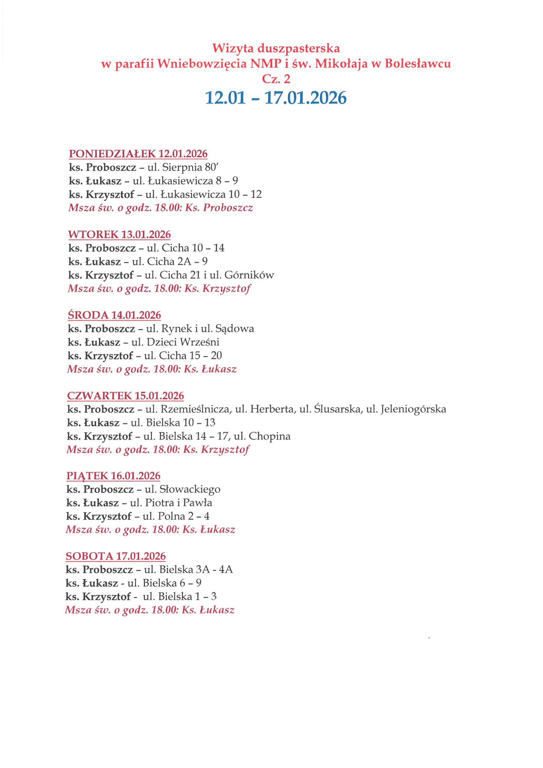 Plan wizyty duszpasterskiej od 12 do 17 stycznia 2026. Zapraszamy do zapoznania się z planem i cieszymy się na spotkanie z rodzinami, które zaprosiły nas do swoich domów.