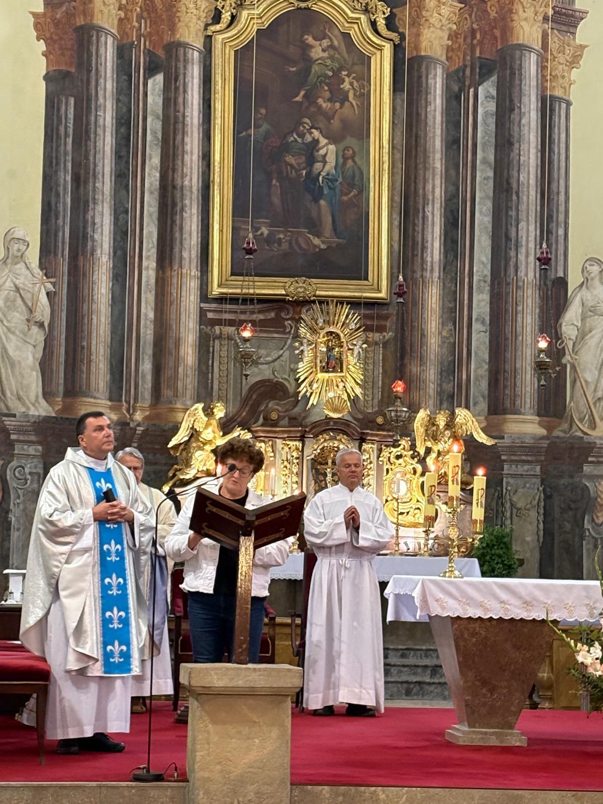 Po przybyciu do Hejnic udaliśmy się do świątyni na Eucharystię. Przewodniczył jej i homilię wygłosił Przewodniczący Rady Parafialnej – proboszcz parafii ks. Bogusław Wolański, a koncelebrował proboszcz Hejnic – ks. prałat Jiří Voleský. Zostaliśmy bardzo serdecznie przyjęci przez kustosza sanktuarium, który nas przywitał i pozdrowił. Wyrażał wielką radość i dumę, że wybraliśmy hejnickie Sanktuarium na miejsce pielgrzymki Rady Parafialnej.